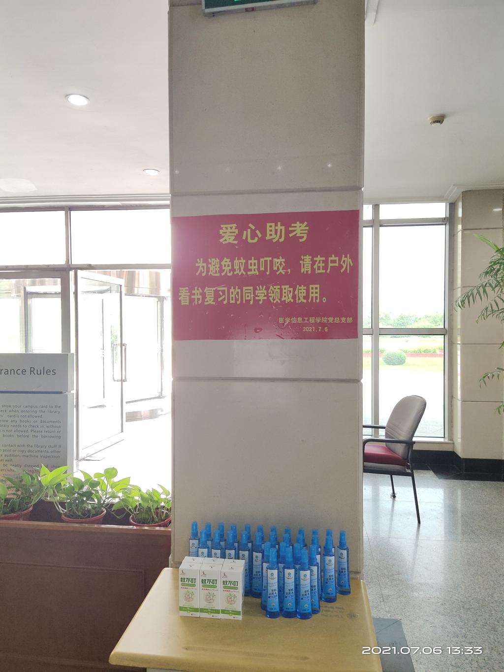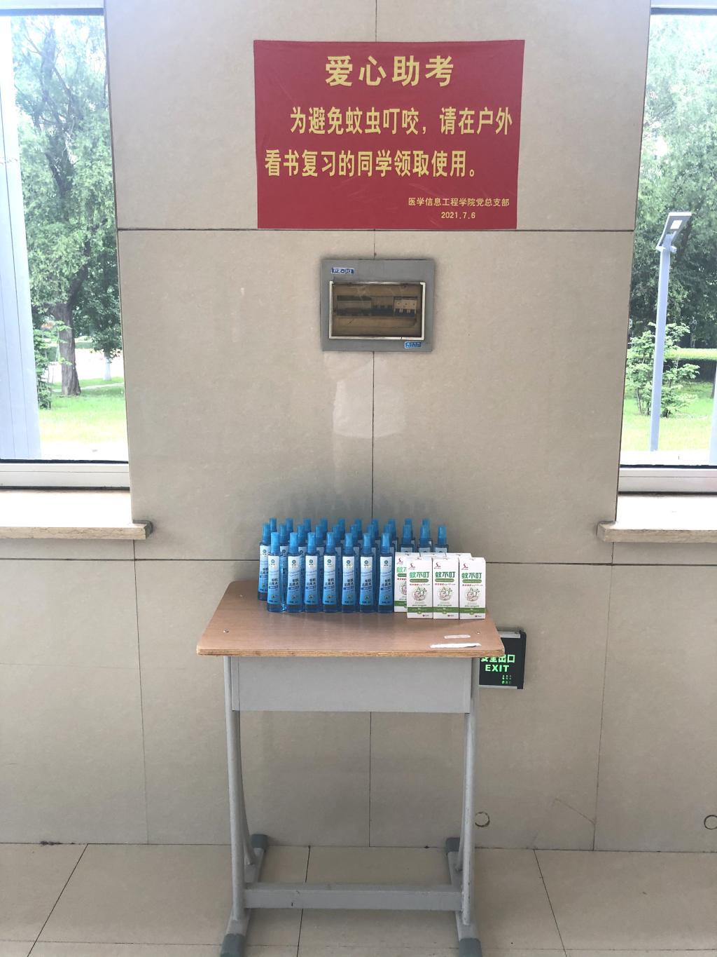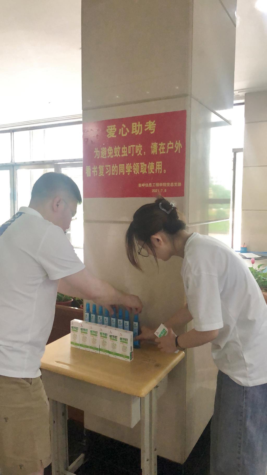 为了帮助期末备考的学生更好地复习,成人影片 党总支部继续开展“践行初心,爱心助考”活动,7月6日,为在户外看书的同学们提供便携式驱蚊花露水,分别放置在致远楼一楼、图书馆一楼大厅,方便学生领取使用。