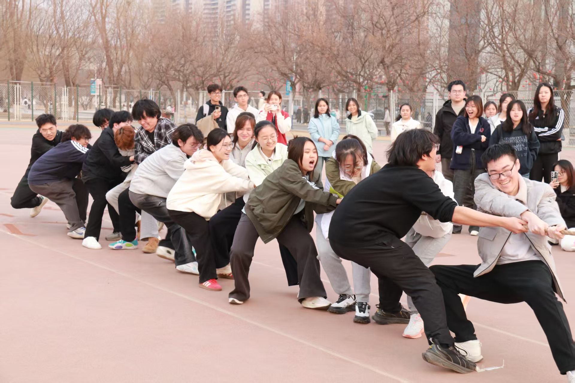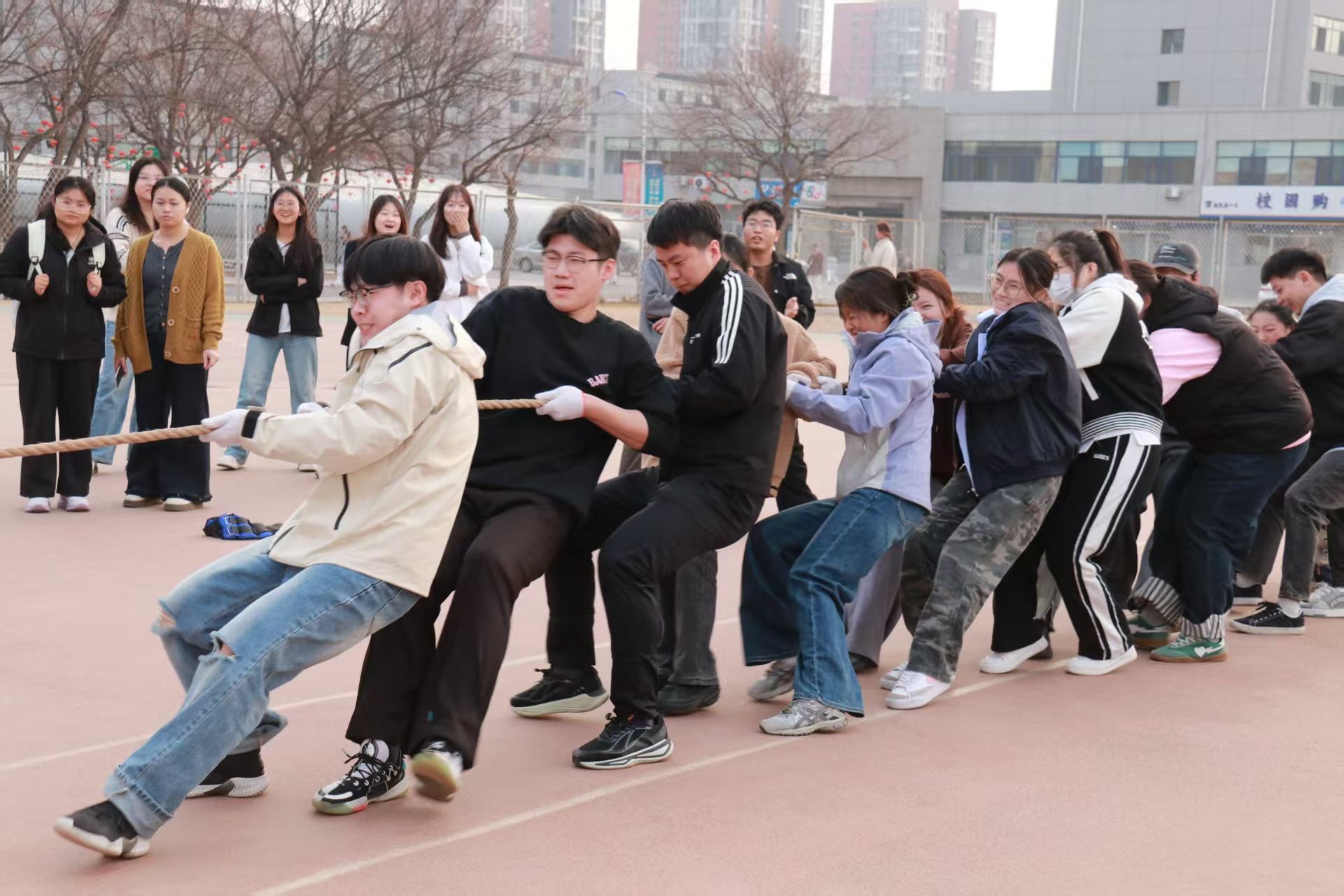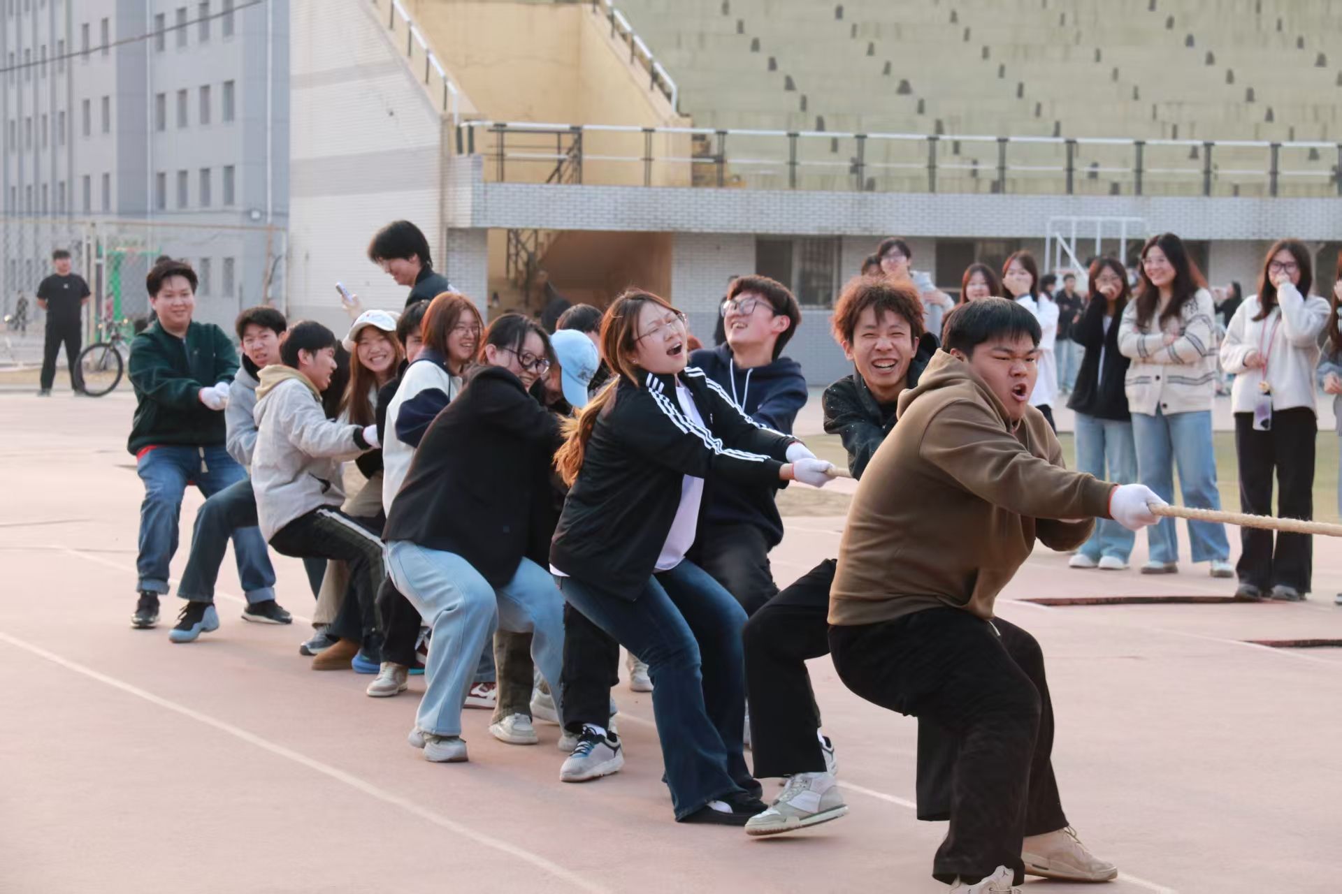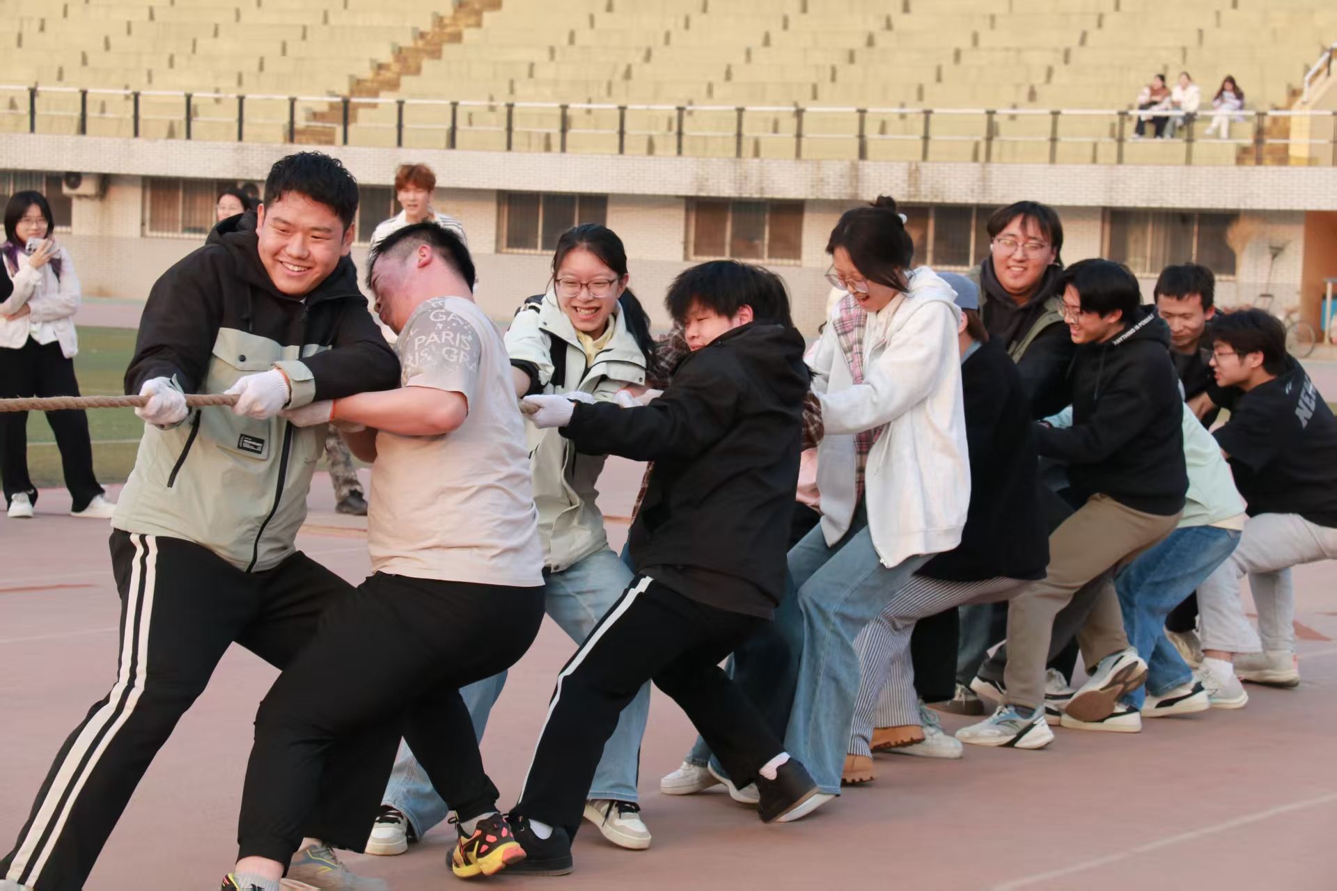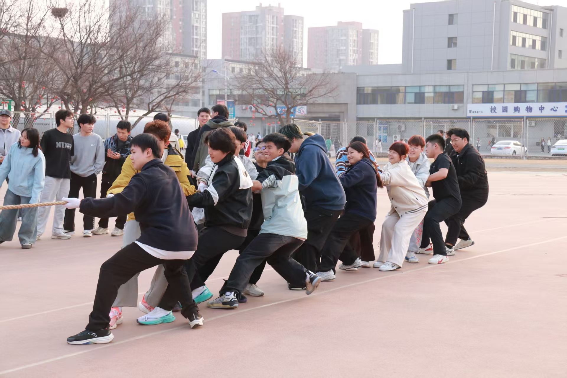 英雄争“拔”赛在操场隆重举行,来自2023级、2024级、2025级的5支代表队齐聚赛场,以团结奋斗之姿展现医信学子昂扬风貌。比赛现场,各队伍紧握长绳、齐心协力,在整齐的号子声中奋力拼搏,围观同学的呐喊助威声此起彼伏,充分彰显了“心往一处想、劲往一处使”的团结精神。