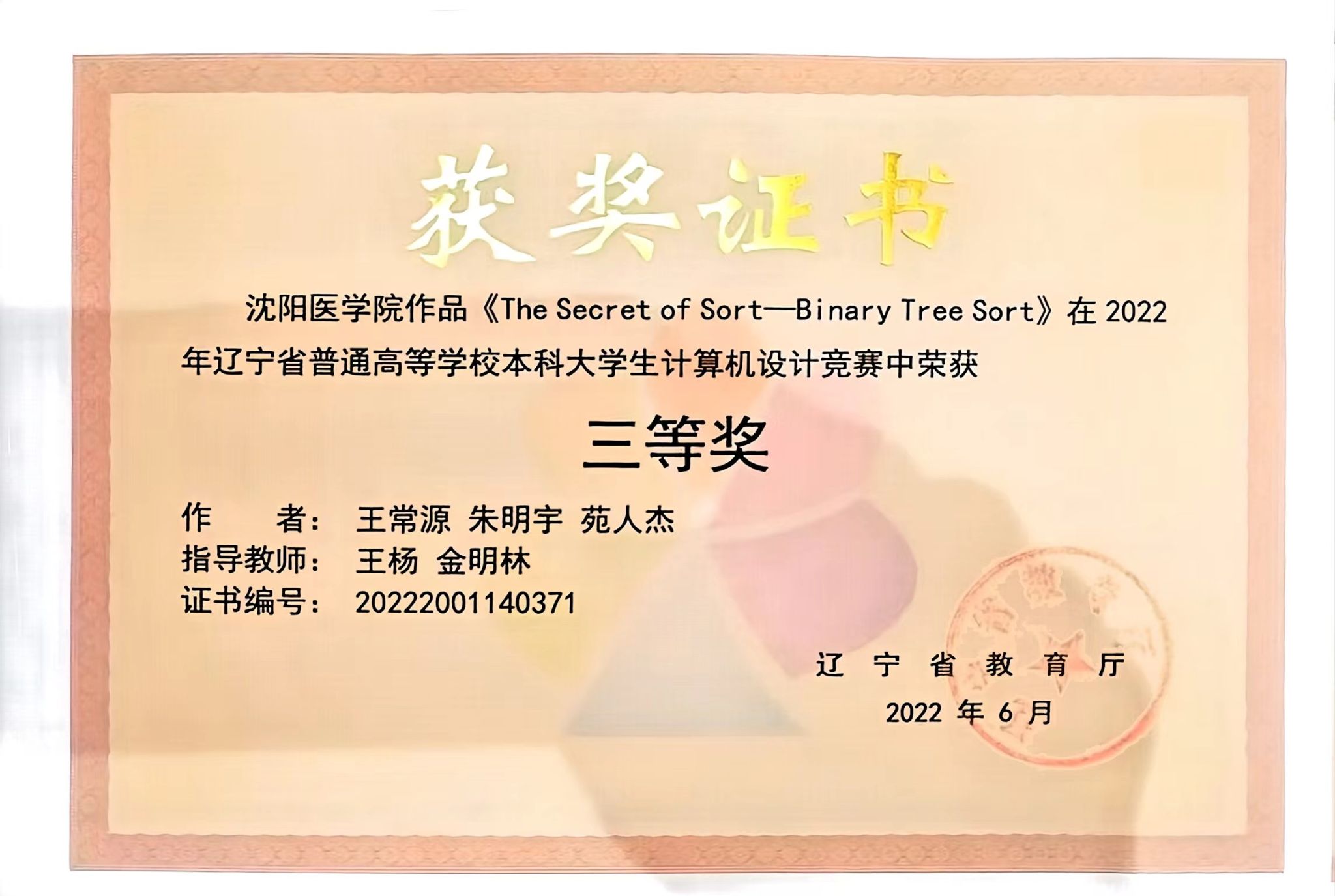 学生团队的作品《The secret of sort - binary tree sort》荣获辽宁省大学生计算机设计大赛三等奖、中国大学生计算机设计大赛三等奖。 在这场激烈的竞争中,我们不仅展示了过硬的技术实力,更传递出了科学探索的精神和团队协作的力量。从项目构思到算法实现,再到现场展示,每一个环节都凝聚了团队成员无数个日夜的辛勤努力和智慧结晶。